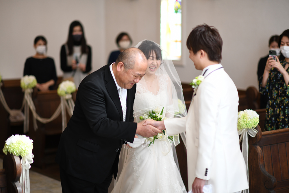 (挙式時)新婦父が新郎と握手をした時に、泣いた場面・・・挙式ではみんな涙を流してくれて、嬉しさでいっぱいでした!