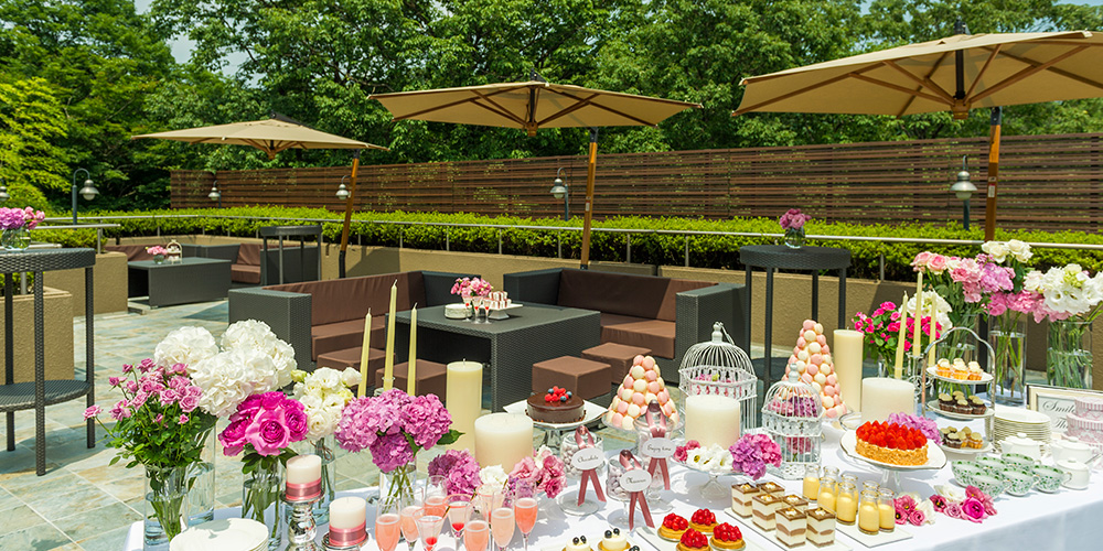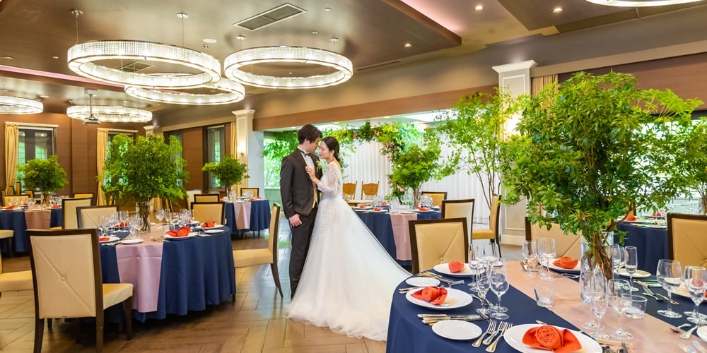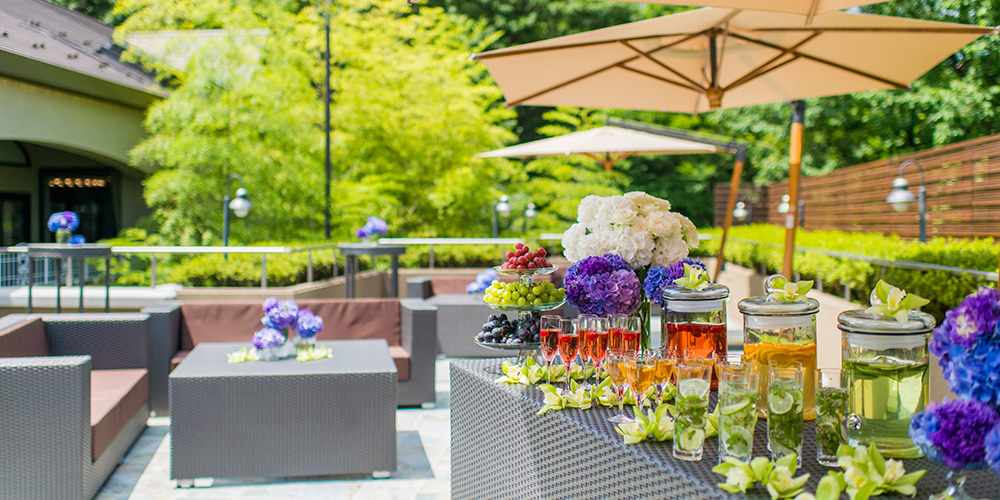 着席 80名ホテル内のメイン会場 Bergamot ベルガモット木の温もりにあふれ 落ち着いた雰囲気の上質な空間には 大きく設計された窓からあたたかな陽光が降りそそぎます併設のテラスでは ウェルカムパーティやデザートブッフェの演出を 爽やかな空気に包まれ 開放感あふれるおもてなしを満喫して