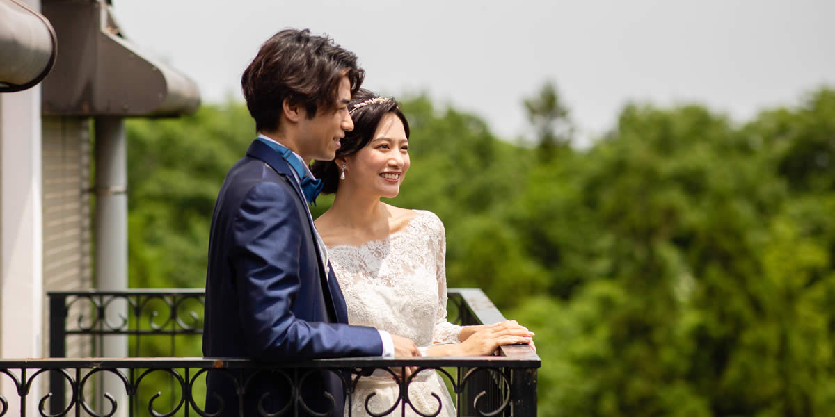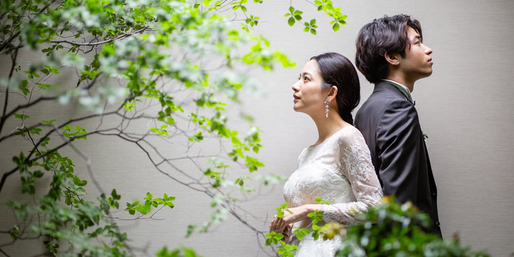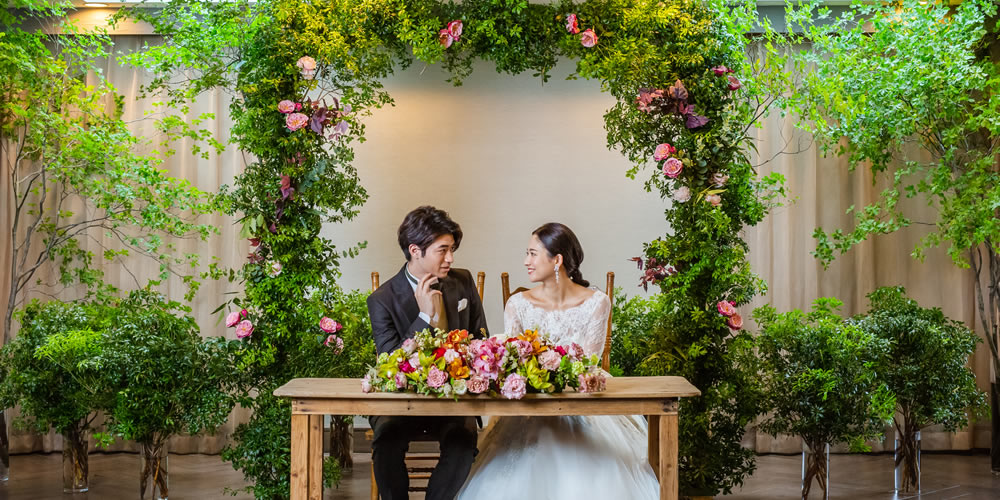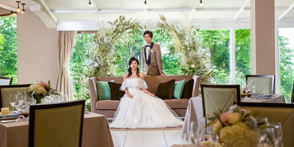 着席 12名ホテル最上階のプライベートなウエディング空間 THE SUITEおふたりの後ろの窓が四季を彩る森の光景を美しく切り取ります明るさで満ちた空間に クラシカルで上質なインテリアが揃い身近な方だけのプライベートなパーティのひとときをゆったりと落ち着いた雰囲気へと演出します