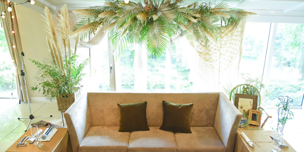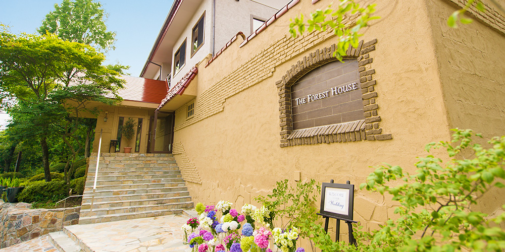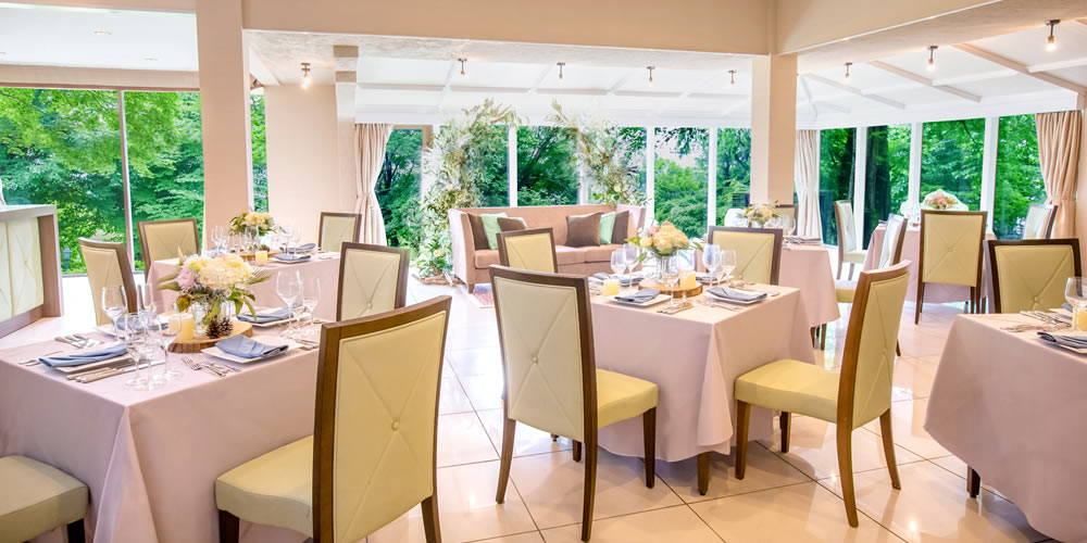 着席 42名ホテル敷地内に建つ ウエディングの邸宅THE FOREST HOUSE窓の外に広がる緑が開放感をもたらすシックな雰囲気はシンプルな設えで統一されコーディネートも自由自在に楽しめますおふたりのお好きな雰囲気にアレンジしてくつろぎの空間に邸宅を一軒使ったアットホームで贅沢なプライベートウエディングを堪能して