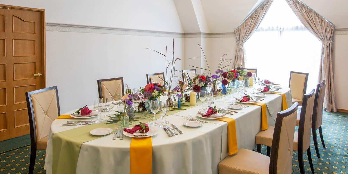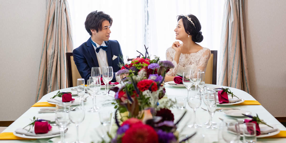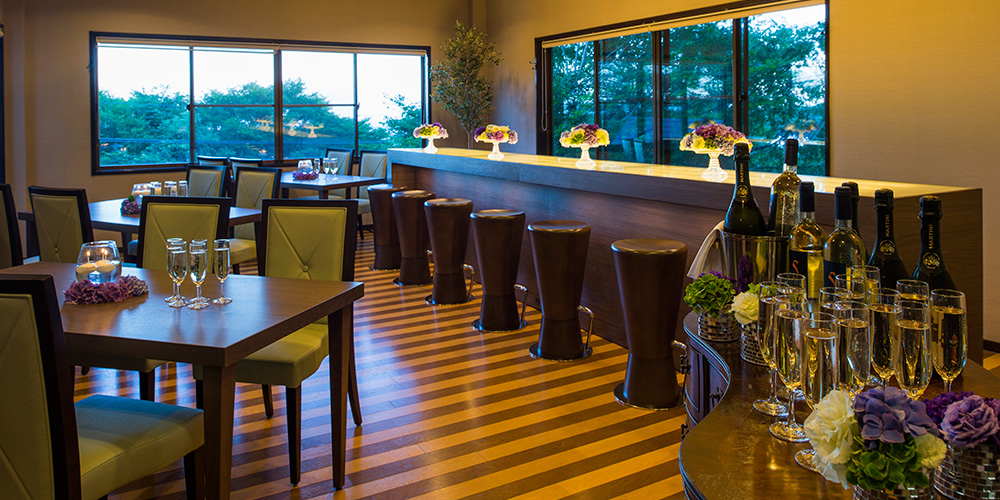 着席 12名ホテル最上階のプライベートなウエディング空間 THE SUITEおふたりの後ろの窓が四季を彩る森の光景を美しく切り取ります明るさで満ちた空間にクラシカルで上質なインテリアが揃い身近な方だけのプライベートなパーティのひとときをゆったりと落ち着いた雰囲気へと演出します