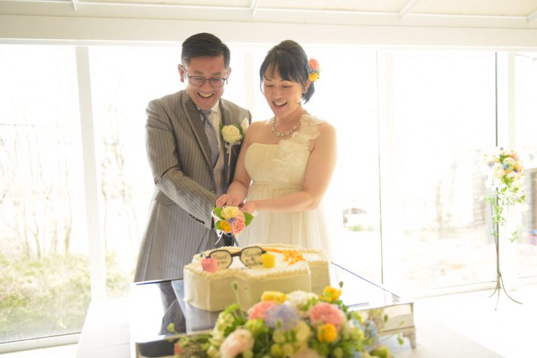 新郎/ケーキ入刀(ウェディングケーキの仕上がりが素晴らしかった)新婦/たれちゃん(白やぎ)&フラワーシャワー(皆の顔が見えて、ホッと一安心)